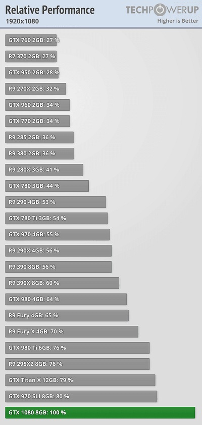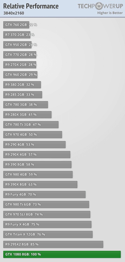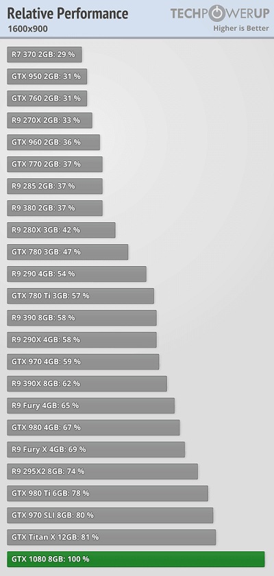 主流显卡相对性能(201605) 作者: gcfan 日期: 2016年5月18日 分类: 显卡评测,首页 暂无评论 浏览次数 4774 喜欢 0 评分 12345 随着GTX1080解禁,TPU终于出新评测了。 主流显卡相对性能天梯图: 1600×900分辨率下(这个分辨率现在基本已经快淘汰了吧): 1920×1080分辨率下(主流2K分辨率): 2560×1440分辨率下(2.5K分辨率): 3840×2160分辨率下(未来两年普及目标4K分辨率):