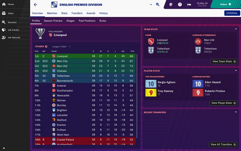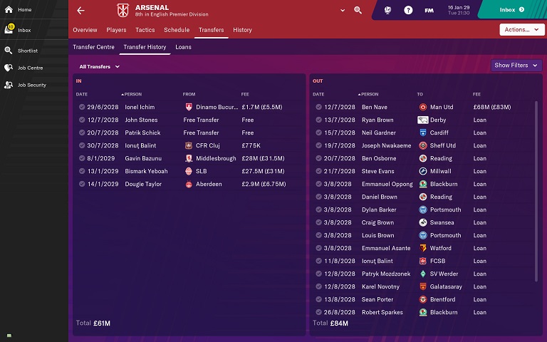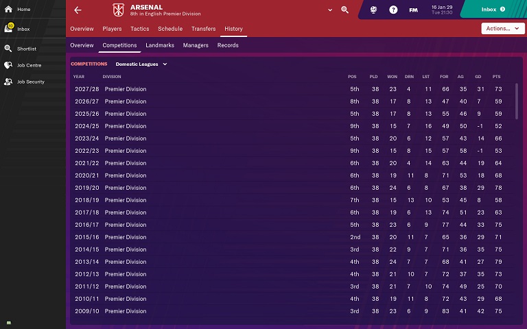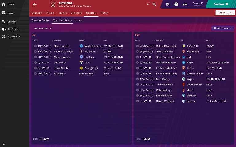 接着上一篇,继续我的FMT2019之旅。赋闲在家的我继续关注着阿森纳的战况。我离开后的一段时间里,成绩确实有了提高。但也并不是很稳定,而且对强队全输了。最终也只是排名第七。