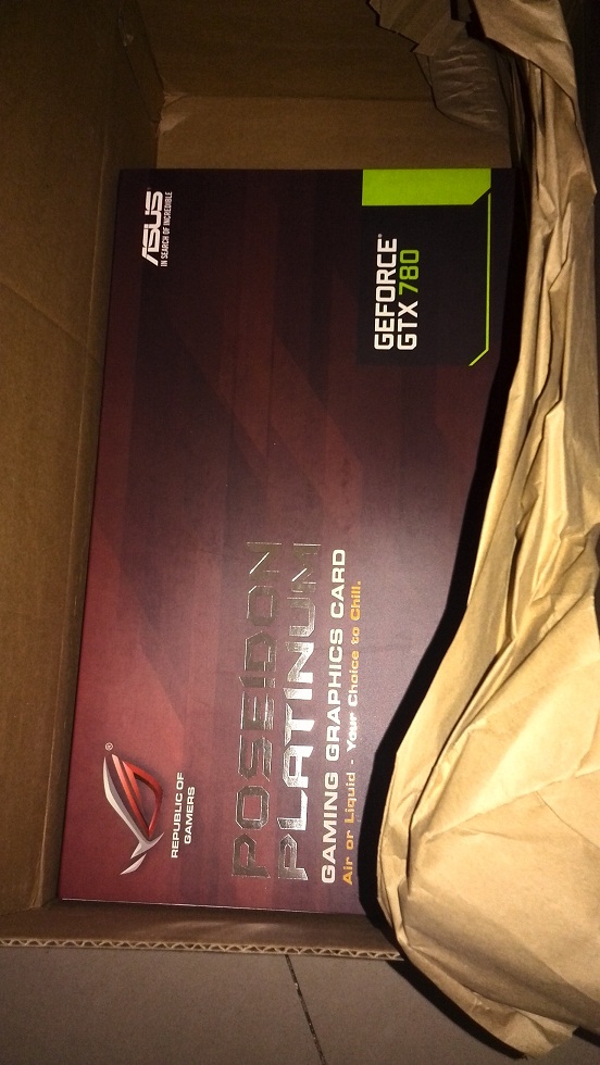 经过网上学习之后,大致了解流程。去国外的B2C网站的显卡类下面看了看,正赶上美亚、美蛋Nvidia家的7系卡都在清库存,一天一个价啊。犹豫直接上EVGA的GTX780ti kingpin还是再来一块GTX780重组SLI。GTX780ti kingpin的价格一直保持在589刀,到手在3700左右,虽然YY度高,上一代的顶级单芯卡,但是价格还是有点高,特别是对比再入一块GTX780组SLI的性价比,最终决定再上一块780。在错过了两块二手公版索泰780之后,入了美亚的华硕海神GTX780。也是考虑到还要上水,加上这块非公780的造型也是很漂亮,好歹也是ROG败家国度系列啊。